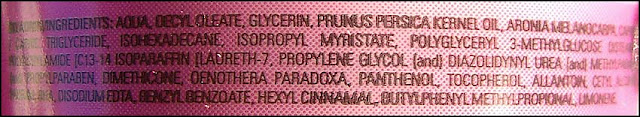 Skład: Aqua , Decyl Oleate , Glycerin , Prunus Persica Kernel Oil , Aronia Melanocarpa , Caprylic / Capric Triglyceride , Isohexadecane , Isopropyl Myristate , Polyglyceryl – 3 Methylglucose Distearate , Polyacrylamide C 13-14 Isoparaffin Laureth – 7 , Propylene Glycol ( And ) Diazolidynyl Urea ( And ) Methylparaben ( And ) Propylparaben , Dimethicone , Oenothera Paradoxa , Panthenol , Tocopherol , Allantoin , Cetyl Alcohol , Parfum , Bha , Disodium Edta , Benzyl Benzoate , Hexyl Cinnamal , Butylphenyl Methylpropional , Limonene.