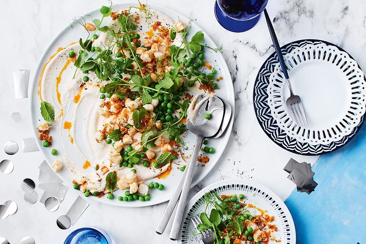 Rozgrzać piekarnik do 180 st. C. Natłuścić blachę do pieczenia i wyłożyć ją papierem do pieczenia. Umieścić głowy i pancerzyki krewetek na przygotowanej blasze i piec przez 25 min. do uzyskania złotego koloru. Umieścić koncentrat pomidorowy i 1/2 szklanki (125 ml) oleju w rondlu na małym ogniu. Smażyć, od czasu do czasu mieszając, przez 5 min. do lekkiego zrumienienia. Dodać upieczone pancerzyki oraz pozostałe 1/2 szklanki (125 ml) oleju i smażyć, od czasu do czasu mieszając, przez 30 min. do uzyskania ciemnoczerwonego koloru. Przecedzić przez drobne sito do miski i odstawić. Wyrzucić pancerzyki. Namoczyć chleb w misce z wodą przez 2-3 min. Włożyć chleb, cebulę i pastę tarama do blendera i zmiksować na gładkie puree. Powoli dodawać olej i oliwę, kolejno sok z cytryny i doprawić. Przykryć i schłodzić. Zblanszować groszek we wrzącej wodzie przez 3 min. Odcedzić, przelać lodowatą wodą i odstawić. Ułożyć skórki chleba na blasze do pieczenia i prażyć w piekarniku przez 5 min. lub do uzyskania złotego koloru. Odstawić do ostygnięcia, a następnie przełożyć do blendera i zmiksować na drobny proszek. Przełożyć z powrotem na blachę do pieczenia i wymieszać z orzeszkami piniowymi, skórką z cytryny i 100 ml oleju. Piec przez kolejne 5 min. do uzyskania złocistego koloru. Odstawić. Umieścić groszek w misce i posiekać miętę. Dodać szczyptę płatków soli i pozostałe 100 ml oleju i delikatnie wymieszać. Rozgrzać olej krewetkowy na patelni na małym ogniu, dodać mięso krewetek i smażyć, od czasu do czasu mieszając, przez 8 min. Rozłożyć taramasalatę na dużym talerzu i posypać sałatką z groszku. Nałożyć na nią ugotowane krewetki i posypać kruszonką z orzeszków piniowych oraz ozdobić pędami groszku cukrowego.