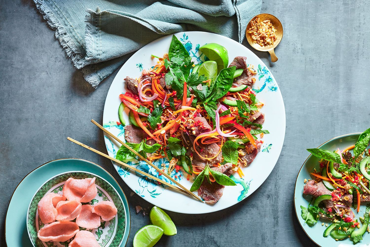 Marynowane warzywa: umieść wszystkie składniki w średniej misce z dużą szczyptą soli i dobrze wymieszać (warzywa nie muszą być całkowicie przykryte płynem). Schłodzić przez 1-2 godz. (nie dłużej, ponieważ warzywa zaczną się rozpadać). Wołowinę wymieszać z innymi składnikami w średniej misce z dużą szczyptą soli, a następnie schłodzić przez 30 min., maksymalnie 2 godz. Połączyć wszystkie składniki sałatki w dużej misce. Odcedzić wołowinę i marynowane warzywa i wymieszać z sałatką. Przełożyć sałatkę na talerz. Udekorować orzeszkami ziemnymi, szalotką i dodatkowymi ziołami, a następnie podawać z ćwiartkami limonki i krakersami krewetkowymi.