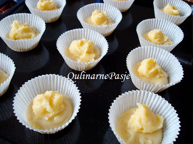 Włączyliśmy piekarnik do grzania, ma osiągnąć temperaturę 180 C, w tym czasie rozkładamy dwanaście foremek na blasze, do każdej foremki dajemy łyżkę ciasta, potem kopiastą łyżeczkę budyniu, który po zgęstnieniu jest dość sztywny, co ułatwia przygotowanie babeczek, bo nie rozpływa się, wiec możemy spokojnie zrobić babeczki.