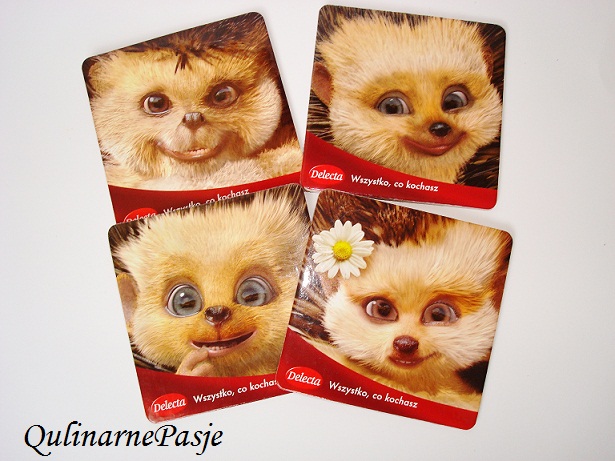I jeszcze jeden niuans, każde opakowanie Babeczek Nadzianych zawiera w opakowaniu taką oto miłą niespodziankę – jeżowe podkładki pod kubek :-) Rodzinka jeżyków może być Wasza, w każdym opakowaniu kryje się jeden z czterech słodkich jeżyków – urocze.