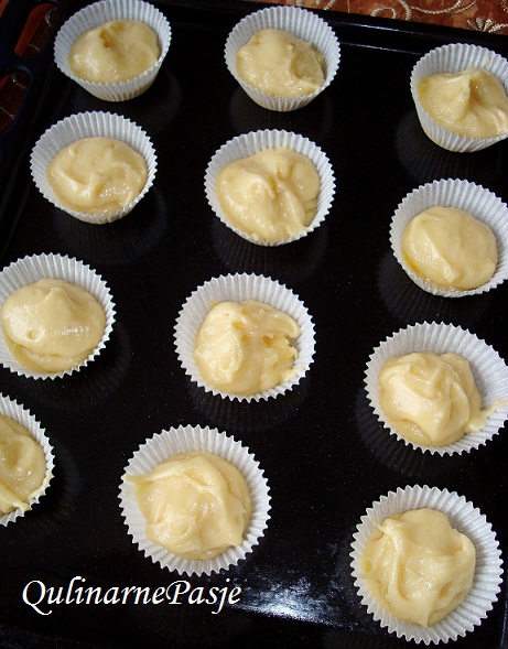 Przykrywamy pozostałym ciastem, zwracając uwagę, aby budyń został w środku, ze wszystkich stron ma otaczać go ciasto, wtedy mamy pewność, że babeczki będą nadziane pysznym waniliowym budyniem. Wstawiamy babeczki do nagrzanego piekarnika i pieczemy 18 – 23 min.