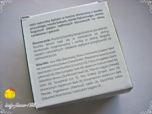 Moja mama obudziła mnie rano (powiedzmy, że jak mam dzień wolny to śpię do upadłego, czyli wstawanie o godzinie 13 nie jest mi obce) i przyniosła paczkę do łóżka z pytaniem czy może otworzyć… Czemu nie? Sama czasem nie wiem co może skrywać kartonowe pudełko czy to bąbelkowa koperta, więc też byłam ciekawa zawartości. Już po otwarciu wiedziałam, że musi to być balsam, ponieważ zapach cynamonu od razu był wyczuwalny. Mama wyciągnęła zawiniątko i dziwiła się jak to możliwe, że już przez celofan tak czuć ten kosmetyk. Od razu wzrok kotka ze shreka pt. „mogę…” i aż żal mi było odmówić, bo mama wręcz ubóstwia zapach cynamonu i szczerze przyznam, że zgłaszając się do testów to ją typowałam jako testerkę numer jeden. Tak, więc specyfik został użyty przeze mnie kilka razy i mogę powiedzieć tyle, że piękny zapach utrzymuje się nawet do rana, jeśli nasmarujemy skórę tuż po wieczornej kąpieli, więc jak dla mnie to dość dobry wynik. Kolejnym aspektem, do którego sceptycznie podeszłam było rozprowadzanie. Najpierw ogrzałam balsam w rękach, a potem trochę zawinięty w celofan specyfik wsmarowywałam (trochę jak mydło, tyle, że o bardziej lekkiej konsystencji) w skórę. Nie wiem jak to będzie jak kosmetyk będzie miał się ku końcowi, ale sądzę, że nie będzie z nim większych problemów. Skóra jest idealnie nawilżona, a ja pięknie pachnąca czuje się po nim zrelaksowana. Jak najbardziej kosmetyk na plus.