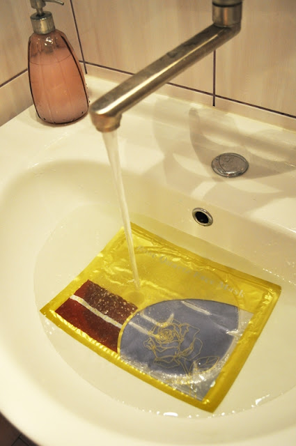 Najpierw trzeba dokładnie oczyścić twarz i wykonać peeling. Potem przygotowujemy maskę do aplikacji- rozgrzewamy ją w ciepłej wodzie- najłatwiej właśnie w umywalce. WAŻNE: Nie rozgrzewajcie maski dłużej niż minutę i nie lejcie wrzącej wody! Ja się kiedyś zagapiłam i nalałam wrzątku- efekt był taki, że nakładałam mamie na twarz maseczkę w kilkudziesięciu częściach…
