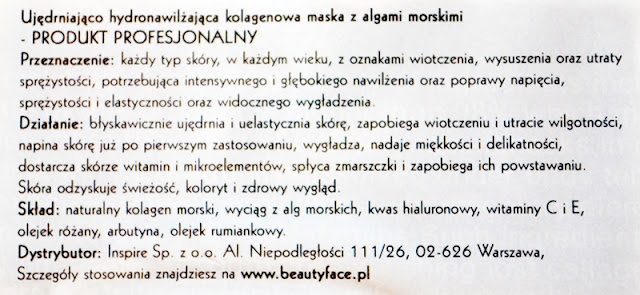 Nie jest to jednak mój pierwszy kontakt z tego typu kosmetykami. Maski od Beauty Face wpadały w moje łapki już kilka razy. Z reguły jednak dopieszczałam nimi moją mamę, której intensywny kolagenowy zabieg jest bardziej potrzebny niż mnie. Sama tylko raz miałam wcześniej na twarzy takiego glutka. A był to glutek antystresowy z ekstraktem z lawendy. Było to dawno, ale jeszcze sporo pamiętam ze względu na to, że efekt był dosyć spektakularny. Na koniec jeszcze do tego wrócę- na razie jednak skupiam się na masce algowej.
