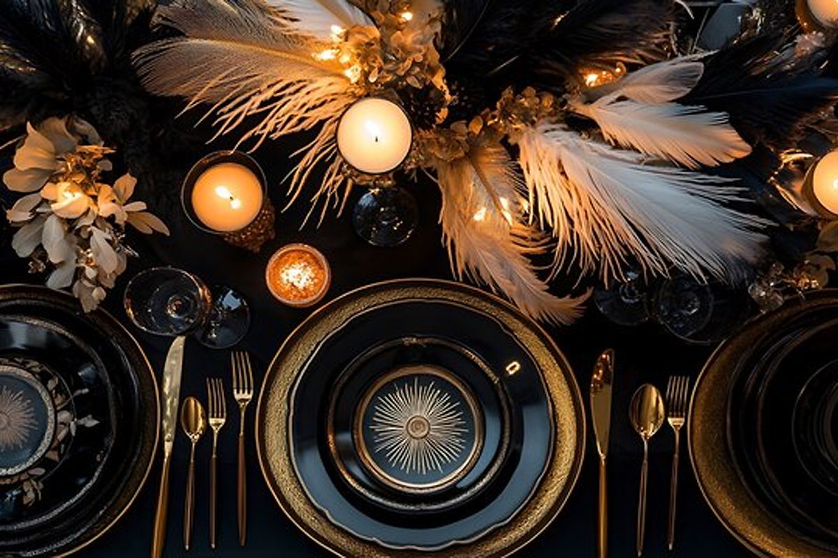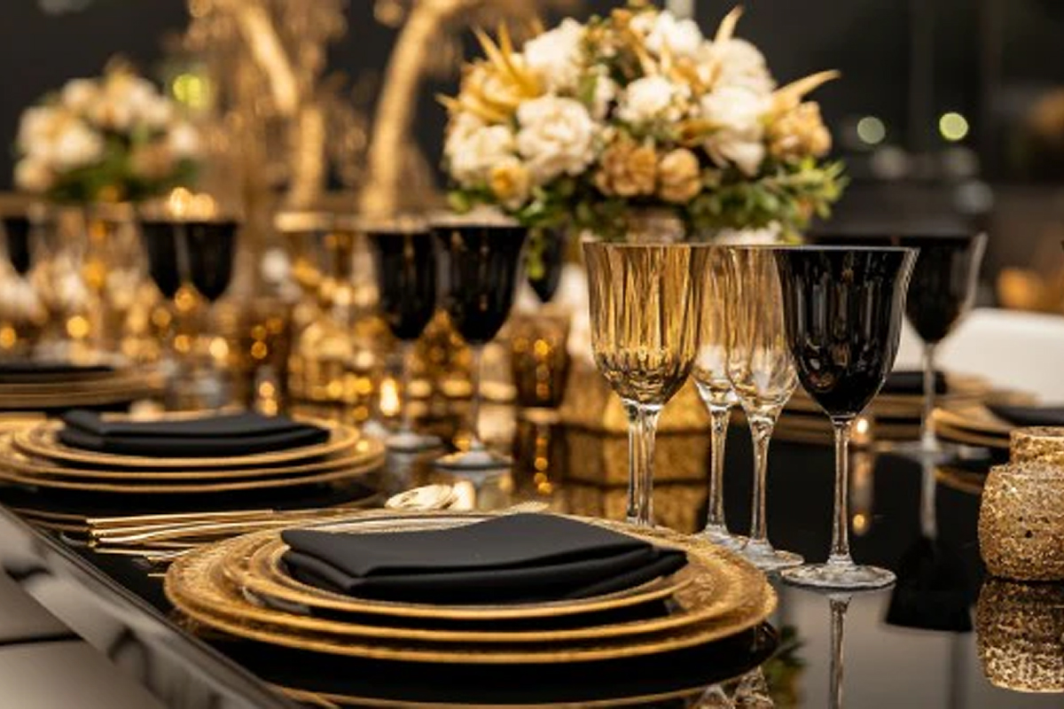Black & Gold Soirée to nie tylko stylizacje, ale także klimat przyjęcia, który tworzą światło, szkło i detale. Na stołach królują czarne obrusy lub bieżniki zestawione ze złotymi podstawkami, świecznikami i szkłem o ciepłym połysku. Coraz popularniejsze są matowe, czarne talerze zestawiane ze złotymi sztućcami, które podkreślają elegancki, wieczorowy charakter spotkania. W dekoracjach dominują świece, metaliczne akcenty, subtelne światła LED oraz elementy inspirowane nocnym niebem.