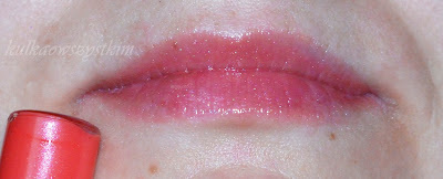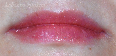 Nie zawiera drobinek, więc daje subtelny efekt, który ja osobiście bardzo lubię.Usta obleczone są lekką metaliczną/opalizującą poświatą. Rzeczywiście są dobrze nawilżone i odżywione.