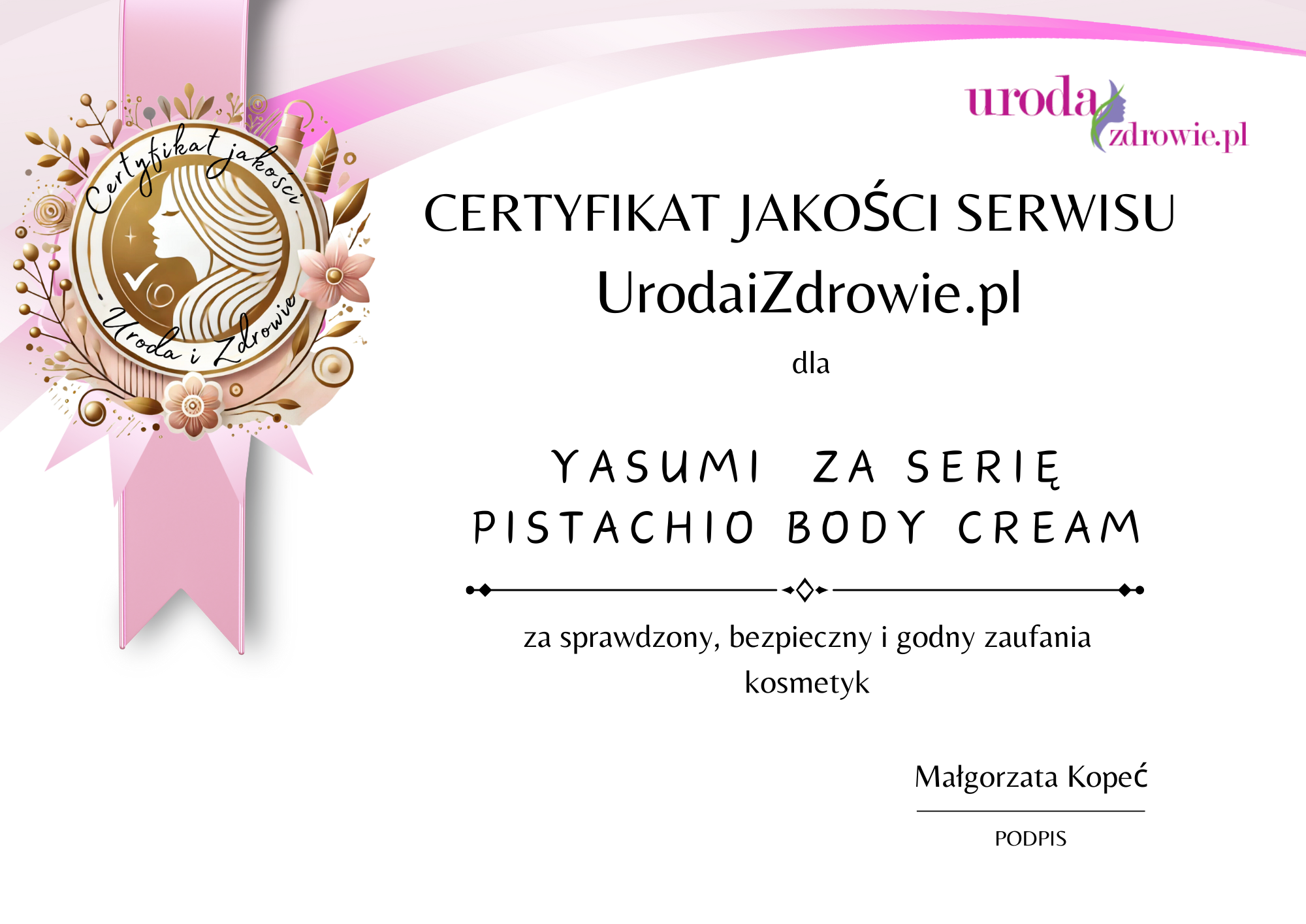 Certyfikat jakości serwisu UrodaiZdrowie – Yasumi Pistachio Body Care