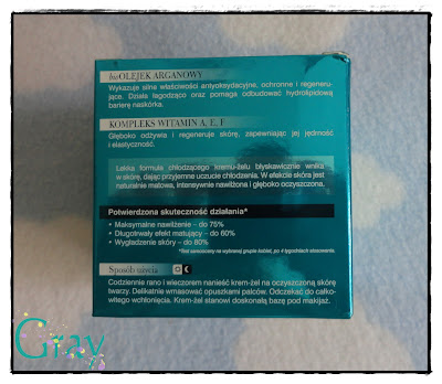 Cóż, zacznę od samej „góry” obietnic – chłodzenie. Nie poczułam go, jednak na pewno krem-żel daje takie uczucie świeżości, ale chłodzenia jako takiego nie zauważyłam właściwie wcale. Dalej matowienie – czy ja wiem. Mimo że moja buźka nie ma wielkiej skłonności do świecenia się, to czasami (kiedy jest bardziej mieszana niż sucha) błyszczy się w tej sferze T – broda, odrobinę nos i trochę czoło – nie wydaje mi się, żeby krem dobrze zapobiegał przed błyszczeniem się cer tłustych, u mnie niedługo po nałożeniu (w te gorsze dni), po góra dwóch godzinach, pojawiało się niewielkie ale zawsze błyszczenie. Nie jestem więc przekonana do tego zmatowienia, ale też nie mam pewności jak się sprawdzi na innych cerach.