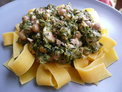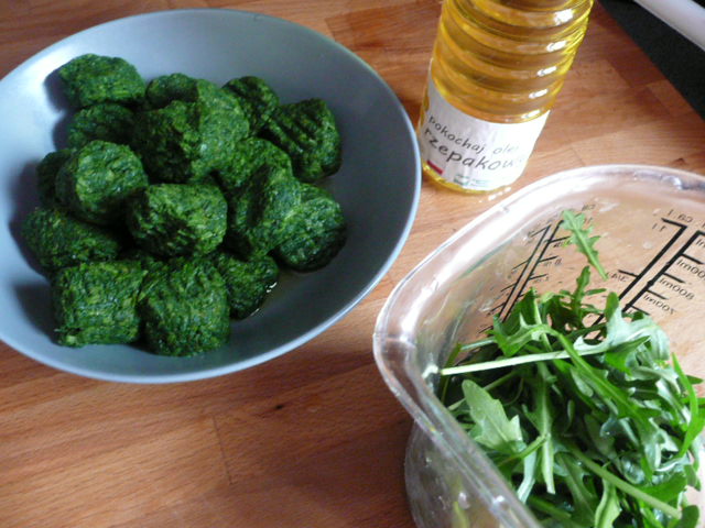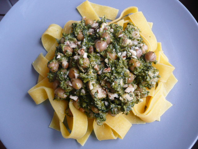 Ciecierzycę namaczam w wodzie najlepiej na całą noc – ok 12 godzin. Piersi z kurczaka kroję w bardzo drobną kostkę aby ładnie komponowała się z ciecierzycą. Wrzucam mięso do woka na rozgrzany olej, doprawiam solą i pieprzem i podsmażam. Cebulę obieram, kroję w kosteczkę i wrzucam do mięsa. Dorzucam szpinak. Mieszam. Rukolę opłukuję pod wodą, siekam lekko nożem i dodaję do reszty. Gdy składniki się w miarę połączą ponownie doprawiam solą i pieprzem oraz chili. Dodaję ciecierzycę i wyciskam ząbek czosnku i dodaję do reszty. Dodaję ser mascarpone i mieszam ciągle podsmażając. Orzechy siekam nożem lub można je również zmasakrować blenderem i dodaję do reszty. Całość mieszam i aby sos nie był zbytnio gęsty dolewam mleka. Można dodać więcej mleka w zależności od tego jak bardzo gęsty sos lubicie. Całość doprawiam chili aby danie było dość pikantne.