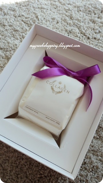 Collagen zapakowany jest w urocze foliowe opakowanie, przewiązane fioletową kokardką :)