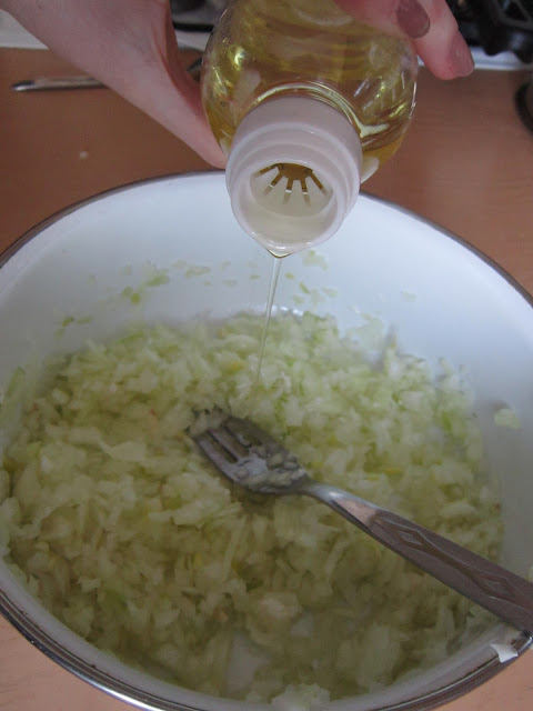 Jajka gotujemy na twardo, obieramy i kroimy w kostkę. Cebulę również obieramy w kroimy w kosteczkę. ( pokrojoną przesypujemy do oddzielnego pojemniczka i dodajemy łyżkę oleju rzepakowego aby cebula zmiękła. )Do cebuli dodajemy pokrojone jajka oraz 2 łyżki majonezu i wszystko mieszamy oraz doprawiamy solą i pieprzem do smaku.