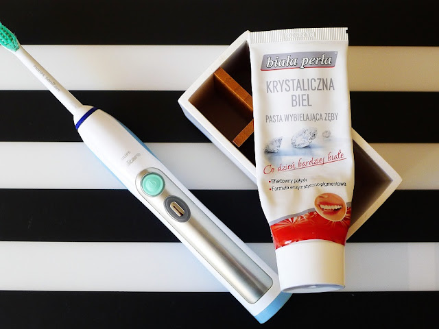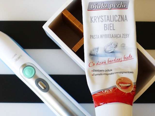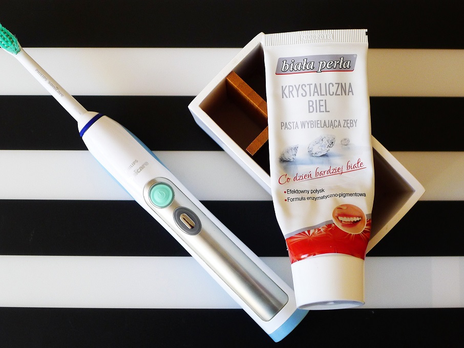 Szczoteczka, po którą sięgam sama to Philips Sonicare, która sprawdza się fantastycznie i uznałam ją nawet za zakup roku. Korzystając z niej w duecie z Białą Perłą ciekawa byłam jaki efekt uzyskam w kwestii ewentualnego wybielenia i przyznam, że tutaj nie jestem ani zachwycona ani nie jestem rozczarowana. Pasta spisała się po prostu dobrze pod względem higienicznym, ale nie zauważyłam żadnego spektakularnego wybielenia zębów – tutaj wszytko pozostało bez zmian. Inną sprawą jest to, że należę do tej grupy osób, które piją dużo kawy i herbaty więc teoretycznie o przebarwienia mogłoby być u mnie łatwo, ale niczego podobnego nie zauważyłam więc pozwolę sobie pod tym względem zachować neutralną ocenę.