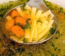 Składniki: 250 g chudej jagnięciny, 250 g kości jagnięcych ze szpikiem, 1 pęczek włoszczyzny, 1 mała cebula, 1-2 łyżki masła, 1/2 filiżanki śruty orkiszowej, sól, czarny pieprz, nieco pietruszki, dwa ziemniaki