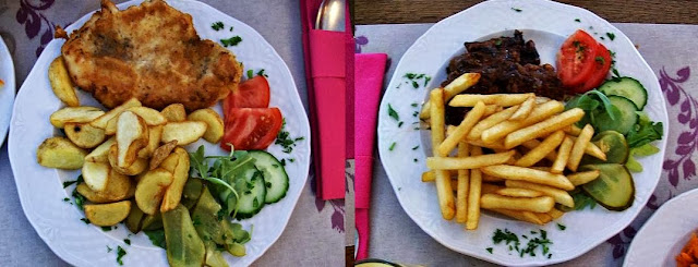 Oczywiście zanim się zdecydowaliśmy co zjemy, minęło trochę czasu. W końcu wybraliśmy ja: kotlet drobiowy w panierce przygotowywanej przez kucharzy i podsmażane ziemniaczki, a Patryk – grillowaną karkówkę z frytkami.Jestem osobą bardzo wybredną, ale obiad naprawdę mi smakował. Kotlet drobiowy był niemal identyczny jak ten, który robi moja mama czy babcia.Podsmażane ziemniaczki również dobrze smakowały, tak samo frytki, które nie ociekały tłuszczem. Nie próbowałam karkówki, ponieważ nie lubię, ale Patryk chwalił danie. Na talerzach nic nie pozostało. Porcja była w sam raz spokojnie można było się nią najeśc. Surówki co prawda nie były skomplikowane, tylko proste, ale za to bardzo dobre. Tak wyglądamy nasze dania: