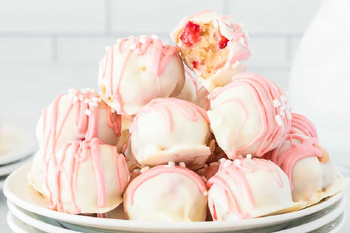 Ciasteczka Golden Oreo rozdrobnić bardzo drobno w blenderze lub wałkiem. Przełożyć do miski, dodać serek kremowy, truskawki liofilizowane oraz wanilię. Wymieszać do uzyskania jednolitej, gęstej masy. Wstawić do lodówki na około 30 min. Ze schłodzonej masy formować małe kulki i układać je na blasze wyłożonej papierem do pieczenia. Wstawić do zamrażarki na 15 min. Białą czekoladę rozpuścić w kąpieli wodnej mieszając do gładkości. Zanurzać kulki w czekoladzie, strząsać nadmiar i odkładać na papier. Od razu posypać truskawkami lub okruszkami ciastek. Wstawić do lodówki na 20-30 min., aż czekolada całkowicie stwardnieje.