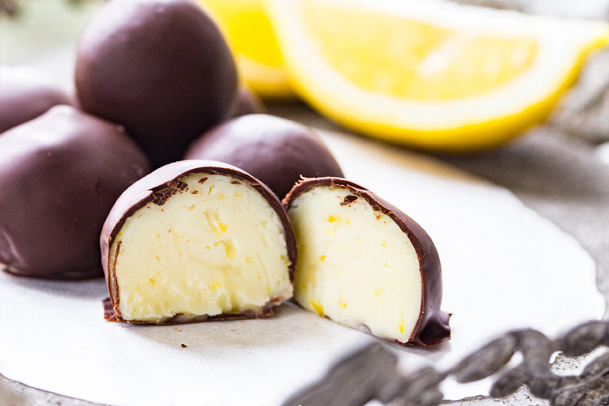 Praliny z białą czekoladą i cytryną w czekoladzie deserowej