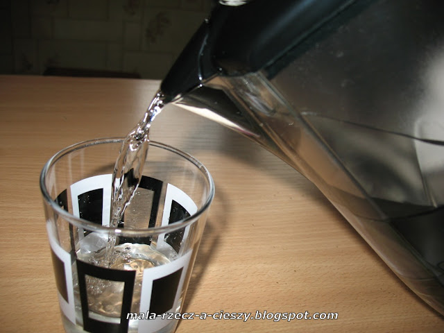 Dzbanek do pracy przygotowałam zgodnie z powyższymi wskazaniami, najpierw wstrząsałam delikatnie filtr w wodzie, zamocowałam go, a następnie przefiltrowałam i wylałam dwa pierwsze dzbanki wody.