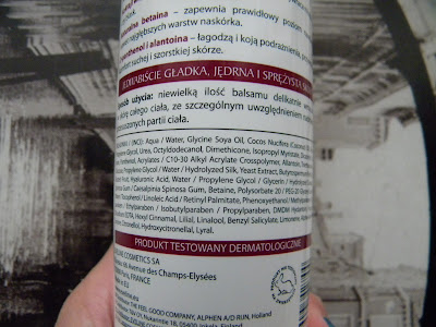 Efekt/Działanie – tutaj jestem pozytywnie zaskoczona – rzeczywiście skóra po jego nałożeniu jest dosłownie jedwabista w dotyku – trochę taka… śliska i milutka. Jednak balsam bardzo delikatnie nawilża skórę – dla bardzo przesuszonej skóry – będzie zdecydowanie za słaby ale efekt jedwabistej gładkości – według mnie rekompensuje te niedogodność – aż mam ochotę się pogłaskać – ciało jest mięciutkie, miłe i delikatne jak u małego dziecka. Efekt nawilżenia utrzymuje się stosunkowo krótko i powinnyśmy smarować nim skórę w kilkugodzinnych odstępach aby podtrzymać ten efekt – to może być lekko uciążliwe ale ponownie – jedwabista skóra po jego aplikacji jest wręcz niesamowita – żaden kosmetyk do ciała nie dawał tak ciekawego efektu.