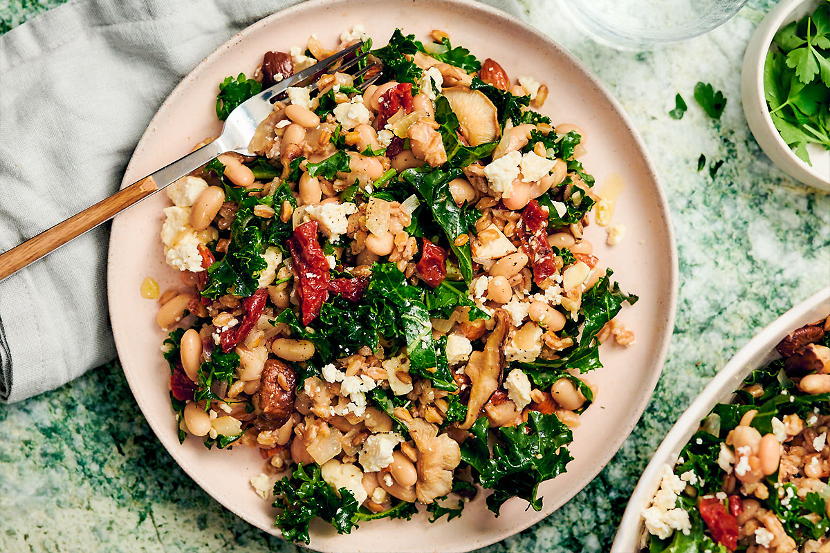 W średnim garnku rozgrzać 1 łyżkę oliwy z oliwek na średnim ogniu. Dodać szalotkę i czosnek i smażyć, często mieszając, przez 2 do 3 min. Dodać farro i bulion warzywny. Wymieszać. Przykryć garnek lekko uchyloną pokrywką, gotować ok. 10 min. Odcedzić farro, zachowując pozostały płyn. Na patelni rozgrzać 1 łyżkę oliwy, dodać pieczarki i smażyć przez ok. 6 min., aż się zarumienią. Doprawić ¼ łyżeczki soli i pieprzu do smaku. W dużej misce wymieszać jarmuż z pozostałą 1 łyżką oliwy z oliwek i sokiem z cytryny. Do miski z jarmużem dodać ugotowane farro, pieczarki, fasolę cannellini, migdały, suszone pomidory, pietruszkę, pozostałą ¼ łyżeczki soli i około ½ szklanki zachowanego bulionu. Wymieszać. Doprawić pieprzem do smaku (i solą, jeśli to konieczne). Posypać fetą.