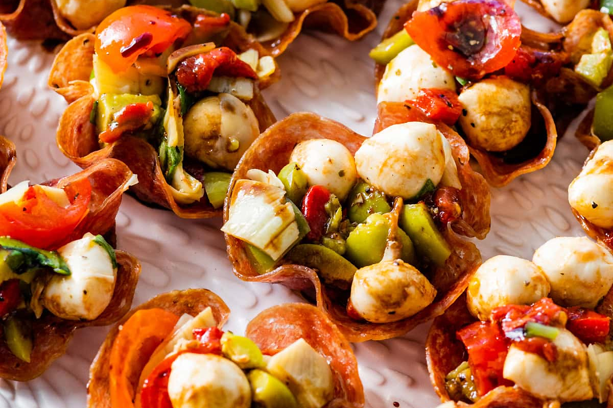 Rozgrzać piekarnik do 190 st. C i lekko natłuścić standardową formę do muffinek lub babeczek. Wcisnąć plaster salami do każdego wgłębienia, formując foremkę. Piec przez 8-10 min. aż będą chrupiące i lekko zwinięte. Wyjąć z piekarnika i pozostawić do całkowitego ostygnięcia w foremce (stwardnieją podczas stygnięcia). Połączyć w misce kulki mozzarelli, pomidorki koktajlowe, pieczone czerwone papryki, oliwki, serca karczochów i bazylię. Skropić oliwą z oliwek i octem balsamicznym, doprawić solą i świeżo zmielonym czarnym pieprzem i delikatnie wymieszać. Nałożyć nadzienie antipasto do każdej foremki salami, a następnie polać glazurą balsamiczną przed podaniem.