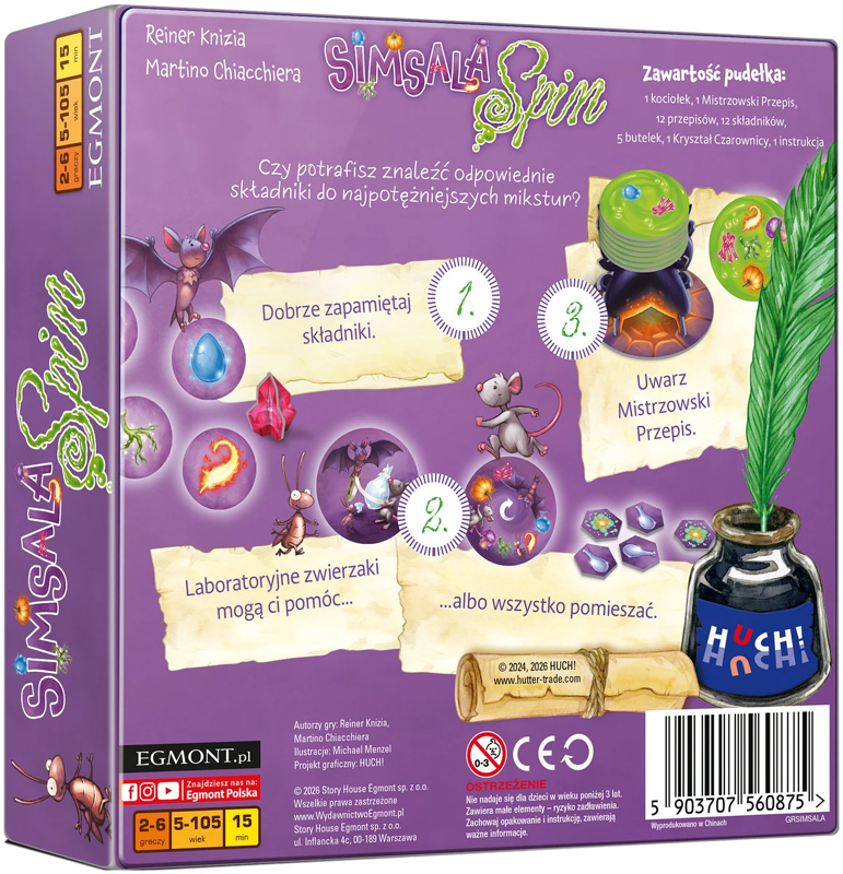 Autoramigry są Reiner Knizia i Martino Chiacchiera, a ilustracje stworzył Michael Menzel. Pudełko zawiera 1 kociołek, 1 Mistrzowski Przepis, 12 przepisów, 12 składników, 5 butelek i 1 Kryształ Czarownicy. Gra kosztuje 89,99 zł i można ją zamówić na www.egmont.pl w sklepach z planszówkami oraz w księgarniach, salonach sieci Empik i marketach prowadzących sprzedaż gier planszowych.