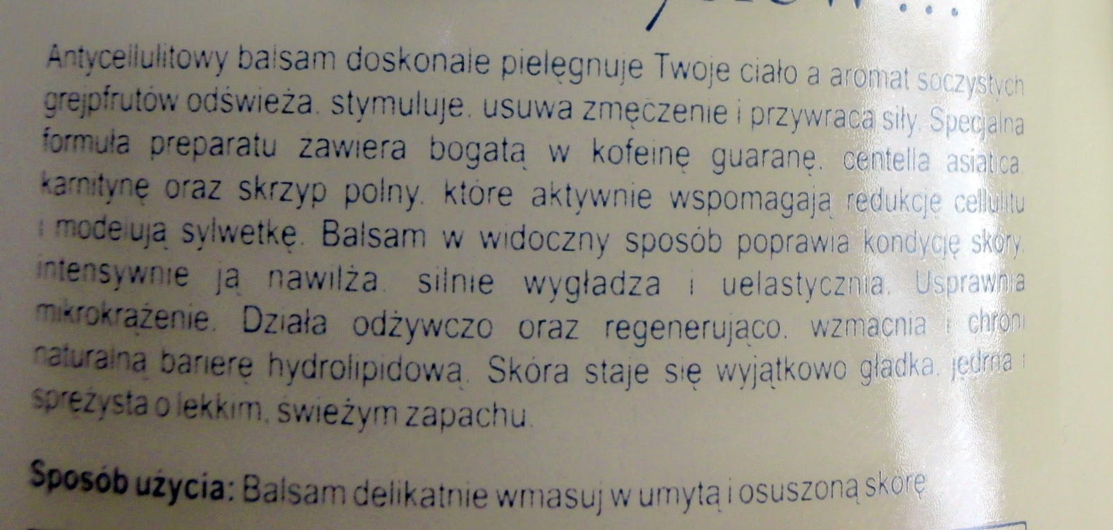Balsam ma za zadanie redukować cellulit… Niestety nie zauważyłam takiego działania lecz nie jestem z tego powodu niezadowolona :) Znakomicie radzi sobie z nawilżeniem nawet najbardziej problematycznej skóry. Łokcie i kolana poddały się działaniu tego kosmetyku i stały się o niebo gładsze i zadbane. Skóra jest jędrna, pachnąca i odświeżona. Konsystencja balsamu leciutka, szybko się wchłania i nie pozostawia po sobie tłustej warstwy.