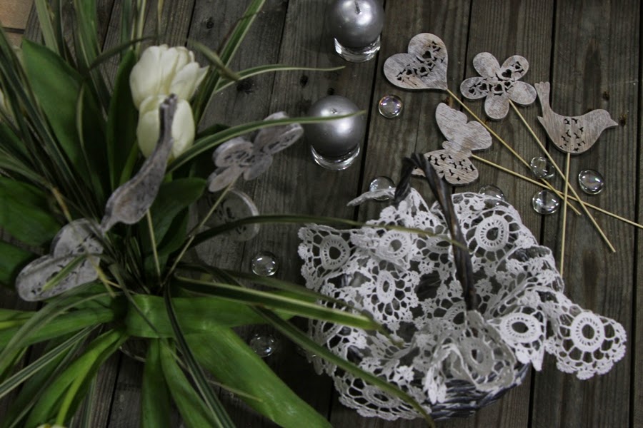 W tym zestawie głównie dodatki mówią o Wielkanocy : białe jajeczka, wazon jak skorupka jaja.