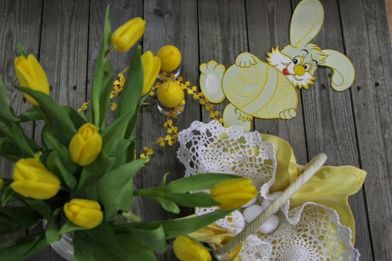 Wykorzystałam do aranżacji m.in : żółtą folię do kwiatów (pod talerz i pod serwetkę do koszyczka), satynową wstążka na sztućce, papierową serwetkę pasującą do żółtych żonkili, transparentną żółtą tkaninę:
