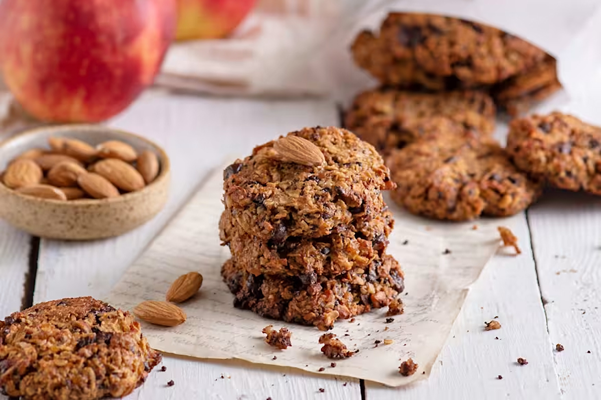 Owoce i migdały drobno posiekać. Dodać jajko, płatki, miód i cynamon. Wymieszać i uformować ciasteczka. Układać na blasze wyłożonej papierem. Piec 12-15 min. w 180 st. C.
