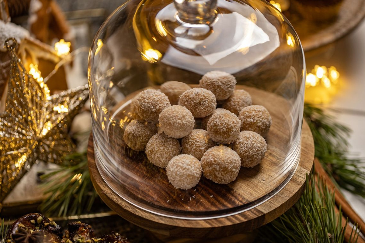 Owoce zblendować z masłem. Dodać pokruszone herbatniki, kakao i konfiturę. Wyrobić masę rękami. Uformować kulki. Obtoczyć w wiórkach kokosowych lub w kakao.