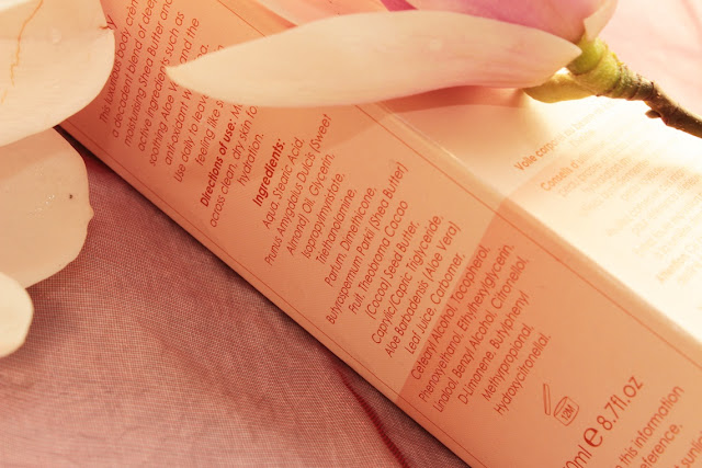 Masło kakaowe i masło shea intensywnie nawilżają skórę ciała podczas gdy aktywne składniki aloesu działają na nią łagodząco, a biała herbata dostarcza jej naturalnych przeciwutleniaczy.