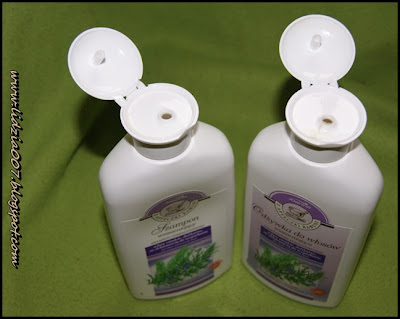 Opakowanie: Obie butelki wyglądają tak samo, różnią się jedynie napisami na naklejkach ;). Zrobione są z białego, nieprzezroczystego plastiku przez co nie wiemy ile zostało nam produktu. Otworki są dość duże, ale nie na tyle by wylatywało się zbyt dużo kosmetyku. Napisy na opakowaniu są czytelne. Szampon jak i odżywka zawierają ekstrakt ze skrzypu i rozmarynu, a na przodzie butelki widnieje obrazek z tymi roślinami, więc jak ktoś się zna to tylko spojrzy i wie co bierze.