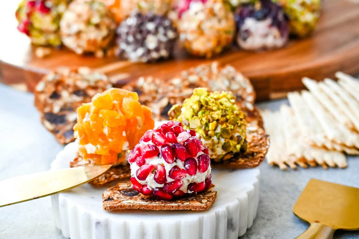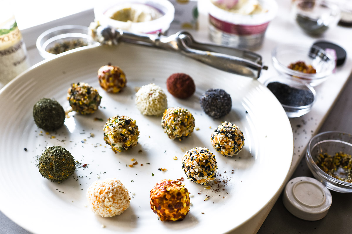 Pokroić serek śmietankowy na 12 kawałków i uformować z każdego kulkę. Połączyć sezam, mak i połowę czosnku w małej misce. W osobnej misce wymieszać zioła i pozostały czosnek. W trzeciej misce połączyć żurawinę i orzechy. Obtaczać kulki serowe w mieszance sezamowej lub w mieszance ziołowej lub w mieszance orzechowej.