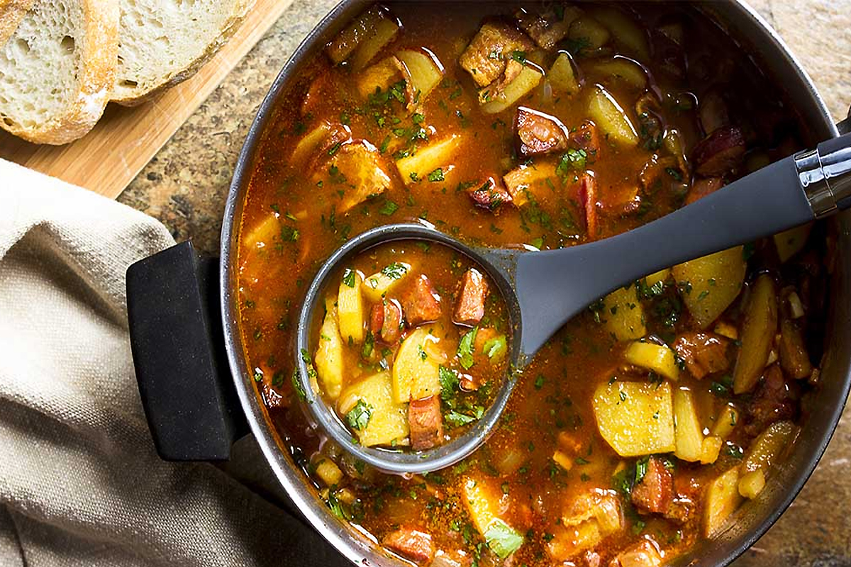 Na oleju podsmażyć pokrojoną w kostkę cebulę, dodać pokrojoną w plasterki kiełbasę chorizo. Chwilkę smażyć, dodać pokrojone w kostkę ziemniaki, chwilkę smażyć, dodać przyprawy, zalać całość gorącą wodą (ok. 3 szklanki) lub bulionem, gotować, aż ziemniaki będą miękkie, dodać świeże zioła. Można również wzbogacić tę zupę dodając paprykę świeżą, marchew lub inne warzywa.