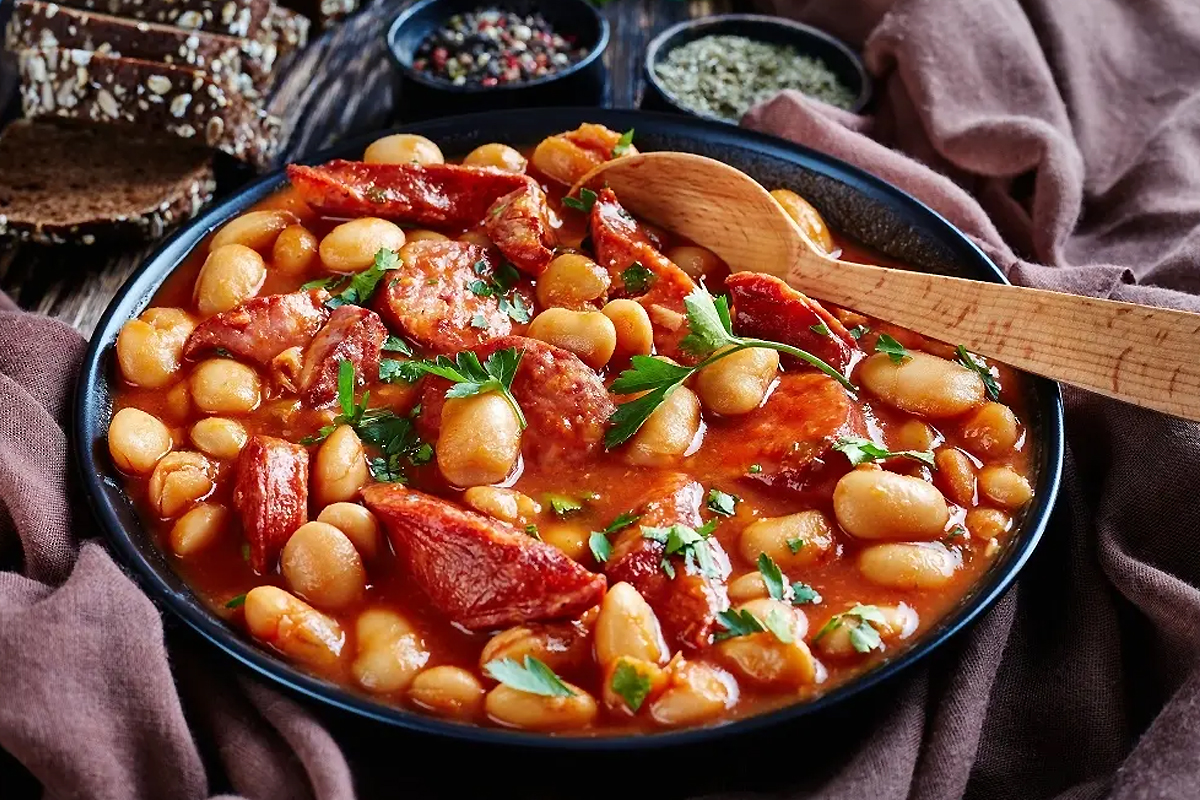 W garnku z szerokim dnem wytopić tłuszcz z boczku. Dodać pokrojoną w półplastry kiełbasę. Wędlinę smażyć 2-3 min., potem dorzucić pokrojoną w piórka cebulę. Smażyć, aż cebula zrobi się szklista. Całość zalać pomidorami z puszki, dodać opłukaną w bieżącej wodzie fasolę z puszki. Wszystko gotować ok. 5 min. Doprawić do smaku.