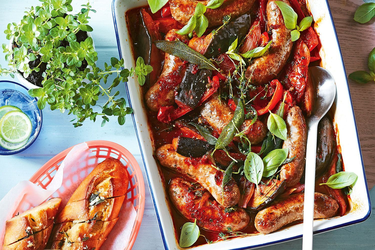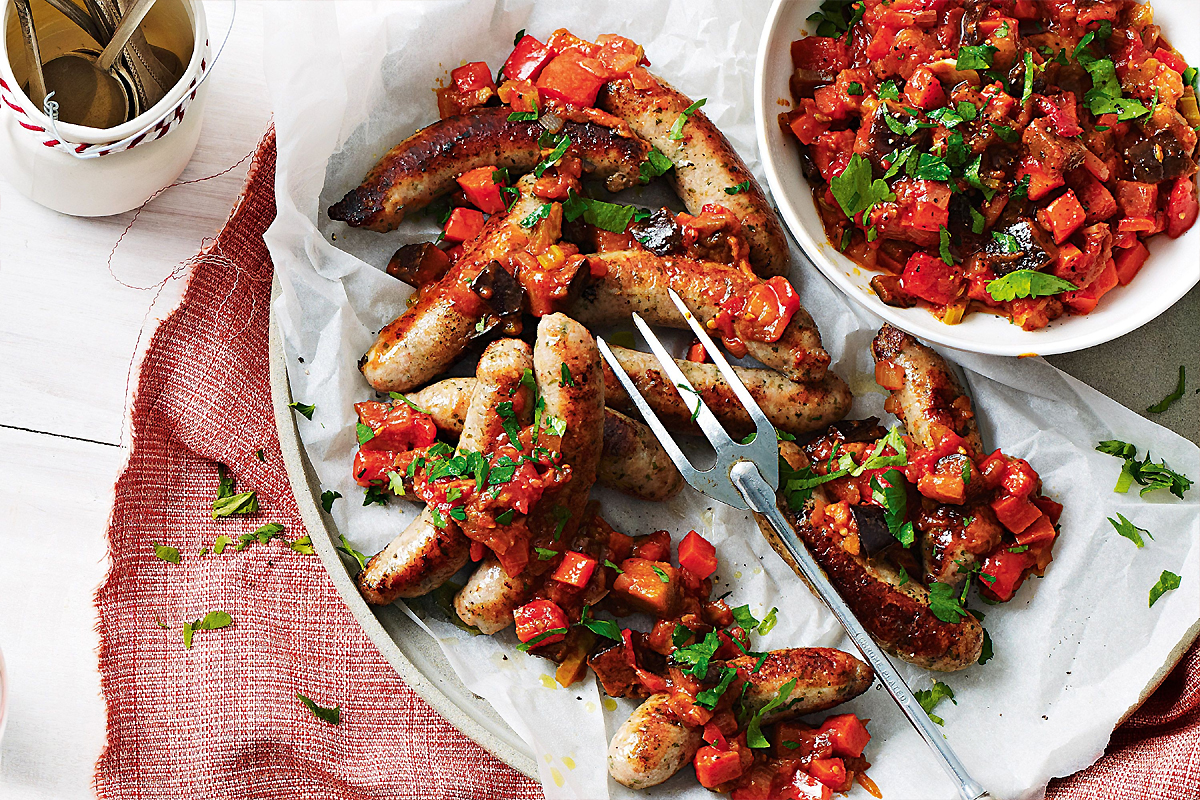Rozgrzać piekarnik do 200 st. C. Rozgrzać 1 łyżkę oleju na patelni na średnim ogniu, dodać kiełbaski i smażyć, często obracając, przez około 7 min. do zrumienienia. Przełożyć na talerz. Dodać resztę oliwy, cebulę, bakłażana i paprykę i smażyć przez 10 min. Dodać połowę czosnku i połowę ziół i smażyć przez 2 min. Dodać pomidory, cukier, kapary i zalewę oraz ¾ szklanki (180 ml) wody. Doprowadzić do wrzenia, gotować przez 2 min., a następnie doprawić. Ostrożnie wlać mieszankę do głębokiego naczynia do pieczenia, dodać kiełbaski i piec przez 30 min. do momentu, aż kiełbaski będą upieczone, a sos lekko zgęstnieje.