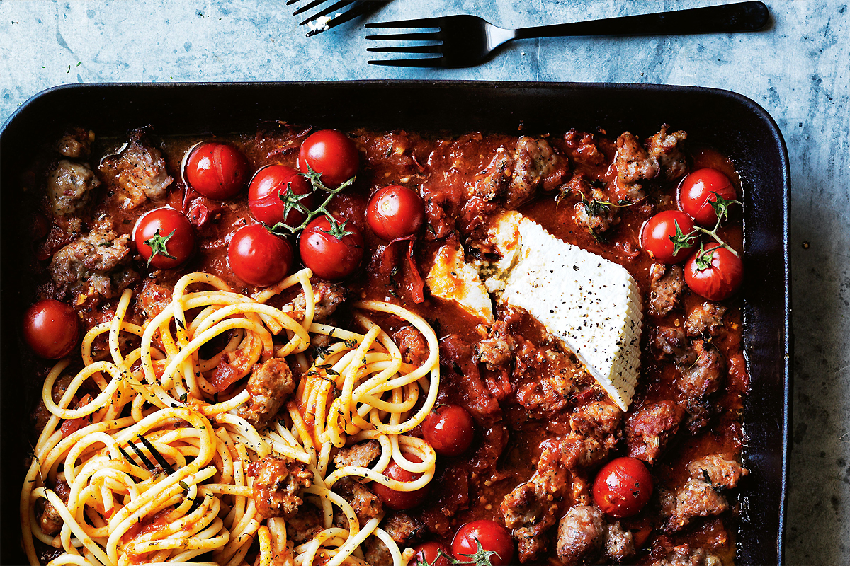 Rozgrzać piekarnik do 220 st. C. Umieścić pomidory, czosnek, tymianek, chili i mięso kiełbasiane w głębokiej blasze do pieczenia. Wlać bulion i skropić oliwą. Doprawić. Piec przez 20 min. do momentu, aż kiełbasa się zrumieni, a pomidory zmiękną. Wyjąć z piekarnika i rozgnieć pomidory. Dodać koncentrat pomidorowy i pomidorki koktajlowe. Piec przez kolejne 10 min. do momentu, aż pomidorki koktajlowe będą lekko miękkie. Podawać z makaronem i ricottą.