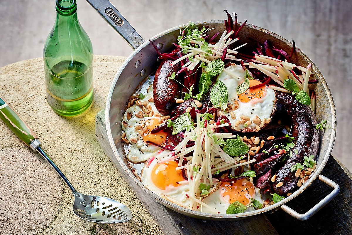 Rozgrzać olej na patelni na dużym ogniu. Dodać kiełbaski i smażyć, od czasu do czasu obracając, przez 8-10 min. Przełożyć na talerz, przykryć i odstawić. Rozgrzać patelnię z powrotem na dużym ogniu, dodać miód i ocet i smażyć, od czasu do czasu mieszając, przez 1 min. do momentu, aż płyn lekko zgęstnieje. Zdjąć z ognia. Przełożyć kiełbaski z powrotem na patelnię i dodać jabłko, buraki, miętę i orzeszki piniowe. Doprawić i podawać natychmiast z jajkami sadzonymi i pietruszką.