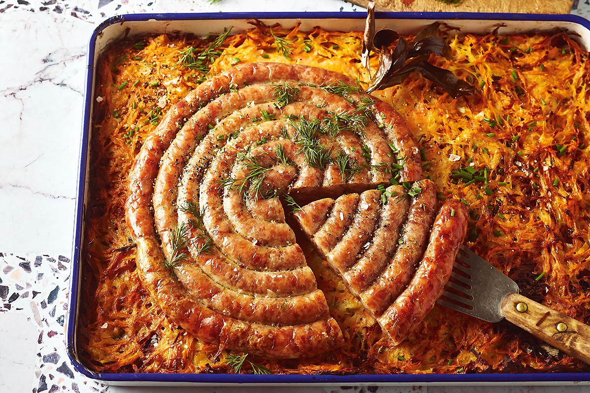 Rozgrzać piekarnik do 200 st. C. Umieścić ocet, 2 szklanki (500 ml) wody i kminek w średnio-dużym rondlu na dużym ogniu. Doprowadzić do wrzenia, następnie dodać kapustę i marchewkę i gotować, od czasu do czasu mieszając, przez 5 min. do momentu, aż warzywa zaczną mięknąć. Zdjąć z ognia i dodać połowę koperku, następnie doprawić solą i odstawić do całkowitego ostygnięcia. W międzyczasie odcisnąć nadmiar wody ze startych ziemniaków. Umieścić je w misce z jajkiem, mąką i połową szczypiorku, doprawić solą i pieprzem i dobrze wymieszać. Przełożyć mieszankę do lekko natłuszczonej formy do pieczenia i delikatnie docisnąć, aby utworzyć równomierną warstwę. Ułożyć kiełbaski w rulon i zabezpieczyć 2 szpikulcami, aby się nie rozłożyły. Ułożyć je na mieszance warzyw i skropić oliwą. Piec przez 45 min. do momentu, aż kiełbaski będą upieczone, a rosti chrupiące. Posiekać pozostałe końcówki koperku i wymieszać z musztardą i pozostałym szczypiorkiem. Posypać kiełbaski dodatkowym koperkiem i podawać z kapustą i musztardą ziołową.
