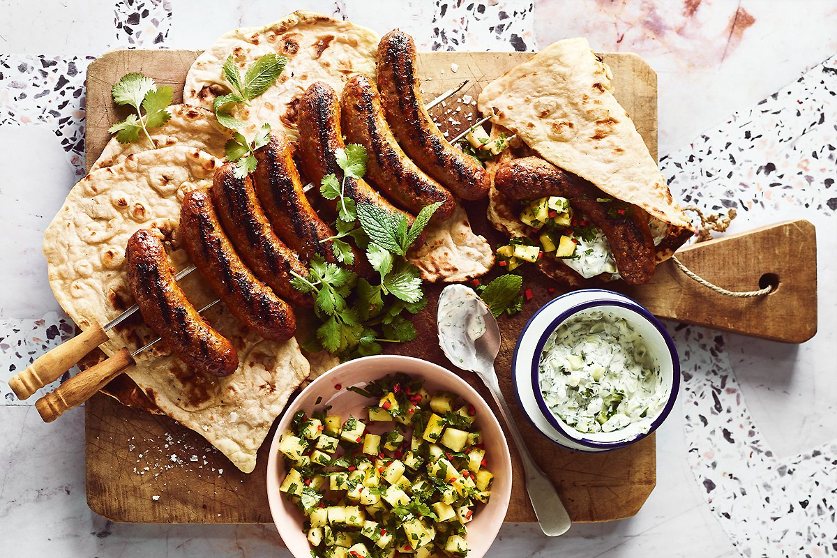 W misce połączyć pastę tandoori z jogurtem. Dodać kiełbaski i dobrze wymieszać. Przykryć i schłodzić przez 30 min. (aby się zamarynowały). Raita: wymieszać wszystkie składniki w misce i doprawić do smaku. Odstawić. Sałatka: wymieszać wszystkie składniki w misce i doprawić solą. Odstawić. Rozgrzać grill lub patelnię na średnim ogniu. Nabić kiełbaski poziomo na 2 metalowe szpikulce. Umieścić na grillu i piec przez 6-8 min. z każdej strony, aż będą przypieczone. Na chlebie naan ułożyć kiełbaski i posypać dodatkowymi ziołami. Podawać z raitą i sałatką.