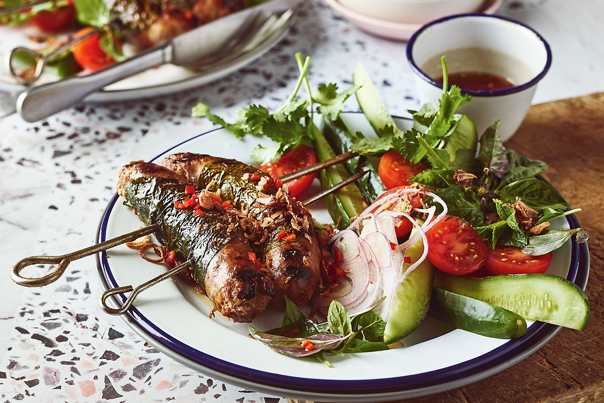 Odłożyć 1 łyżeczkę pasty curry do dressingu. Wlać pozostałą pastę curry i śmietankę kokosową do dużej miski i wymieszać. Dodać kiełbaski i wymieszać. Marynować min. przez 20 min. w lodówce. Wyjąć kiełbaski z marynaty i owinąć każdą liściem betelu. Nabić 2 kiełbaski na 2 szpikulce, aby zabezpieczyć liście betelu. Schłodzić do momentu smażenia. Umieść chili, czosnek, cukier, sos rybny, sok z limonki, 2 łyżki wrzącej wody w misce i mieszać, aż cukier się rozpuści. Odstawić. Rozgrzać patelnię grillową lub grill na średnio-niskim ogniu. Posmarować kiełbaski olejem i smażyć przez 12-15 min. z każdej strony. Na talerzach ułożyć ogórek, pomidora, cebulę i zioła, a następnie udekorować kiełbaskami. Przed podaniem polać dressingiem i posypać chrupiącą szalotką.