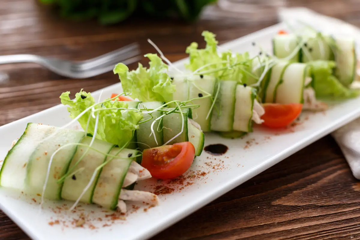 Awokado i paprykę pokroić w słupki. Ogórki pokroić wzdłuż na cienkie, długie pasma. Sparzyć je w osolonym wrzątku, skropić zalewą z imbiru. Odłożyć do wystudzenia. W paski ogórka zawijać po kilka kawałków awokado, papryki oraz kiełki, dołożyć po kawałku łososia, paluszka krabowego lub krewetkę i po 2 płatki marynowanego imbiru. Roladki spiąć wykałaczkami. Podawać z sosem sojowym zmieszanym z octem ryżowym i posypane sezamem.