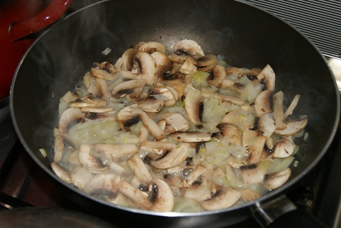 Kroimy pieczarki drobno, gdy cebula się zeszkli, dodajemy je na patelnię.