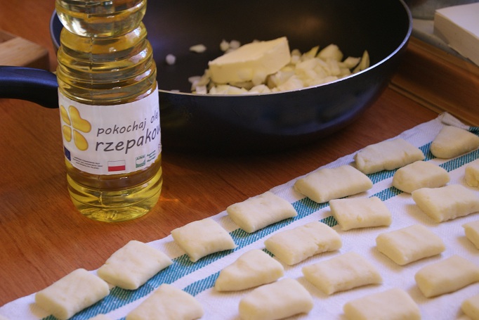 Ziemniaki mielimy w maszynce do mięsa na średniej siatce. Dzielimy je po zmieleniu na 4 części, jedną przekładamy „na górę”ziemniaków lub odkładamy na chwilę na bok. W miejsce tej 1/4 części ziemniaków wsypujemy dokładnie tyle samo mąki. Dodajemy mąkę ziemniaczaną, jajko, solimy odrobinę i wyrabiamy ciasto (gdy za bardzo klei się do ręki podsypujemy jeszcze mąką). Odrywamy po kawałku ciasta i na stolnicy robimy cienki „wężyk”, przygniatamy delikatnie na płasko, kroimy na kwadraty (lub romby).