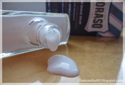 Balsam po goleniu podobnie jak krem do golenia zapakowano w kartonik i dołączono do niego ulotkę. Różnica między nimi jest tylko taka, że balsam znajduje się w szklanej, kanciastej buteleczce, której pojemność to 100ml. Podobne buteleczki widywałam w wodach po goleniu. Tu, jeśli chodzi o opakowanie, M. był bardziej krytyczny. Szklana buteleczka w połączeniu z mokrymi dłońmi wydała mu się mało praktyczna i bezpieczna. Ja uważam, że faktycznie może i jest mało bezpieczna, ale na łazienkowej półeczce prezentuje się o wiele lepiej niż niejeden kosmetyk w plastikowym opakowaniu.