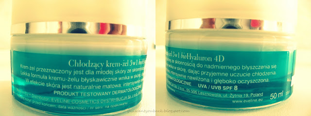 Posiada filtr przeciwsłoneczny SPF 8. Jest świetnym ukojeniem w gorące dni – naprawdę po aplikacji chłodzi skórę, bardzo fajne uczucie. Moim zdaniem nadaje się tylko na dzień, na noc jest jednak zbyt lekki. Nie zapycha, nie ściąga skóry, nie przesusza. Skóra po nim jest bardzo gładka. Fajny, fajny!