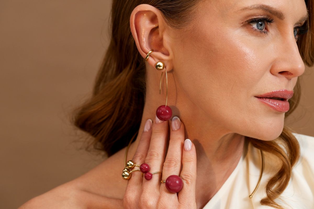 Kiedy do formy kuli dochodzi kolor, kolekcja zaczyna mówić innym językiem. Bardziej osobistym, nastrojowym. Naszyjnik z bordową kulą oraz bransoletka w tym samym odcieniu wprowadzają energię i uwagę. W podobnym tonie działa pierścionek z bordową kulą – głębszy, bardziej nasycony, idealny do stylizacji o wieczorowym charakterze. Ciepło pojawia się w odsłonie brązu.