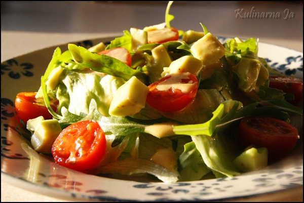 Warzywa myjemy. Sałatę rwiemy na mniejsze kawałki i układamy z rukolą na talerzyku. Na sałacie układamy przekrojone na pół pomidorki i awokado pokrojone w kostkę.