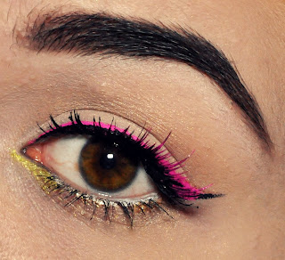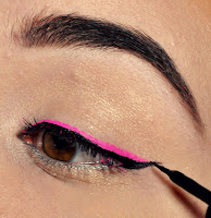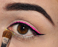 2. Wymieszaj odrobinę różowego cienia (paletka Sleek Acid) z płynem Duraline w proporcjch 1:1. Konsystencja musi być płynna i bez grudek. Wypróbuj kolor na dłoni, następnie cienkim pędzelkiem namaluj kreskę wzdłuż linii rzęs.By ułatwić sobie zadanie, najpierw namaluj linię od wewnętrznego kącika do połowy powieki, następnie narysuj „ogonek” kreski i połącz obie linie razem. Odczekaj chwilę, aż kreska wyschnie.